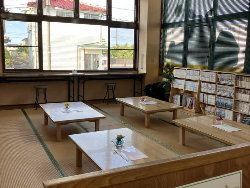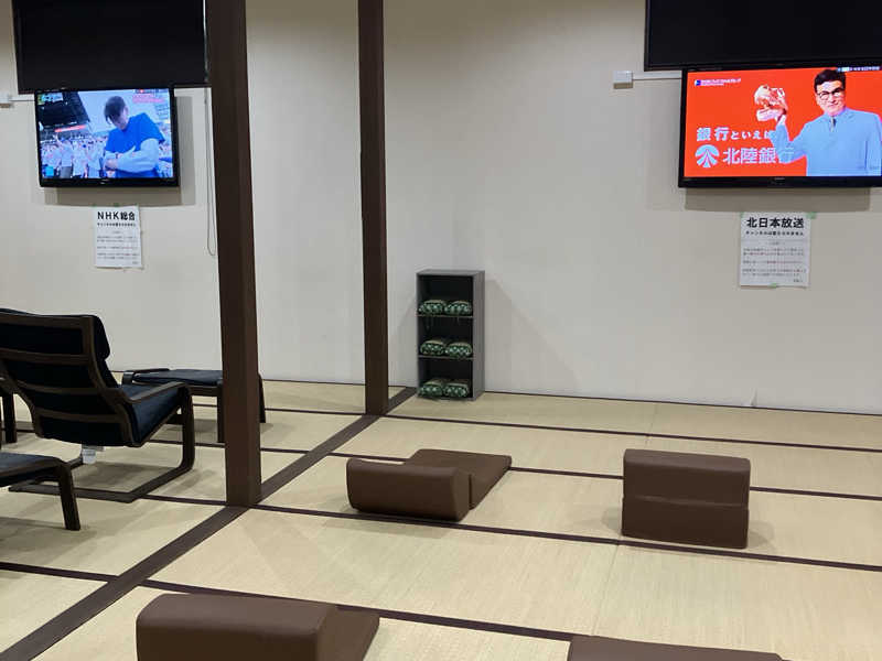 薄暗く広い空間、横に寝そべる所があり敷きタオルを敷いて横になる感じみたい、定員は20人くらいかな?