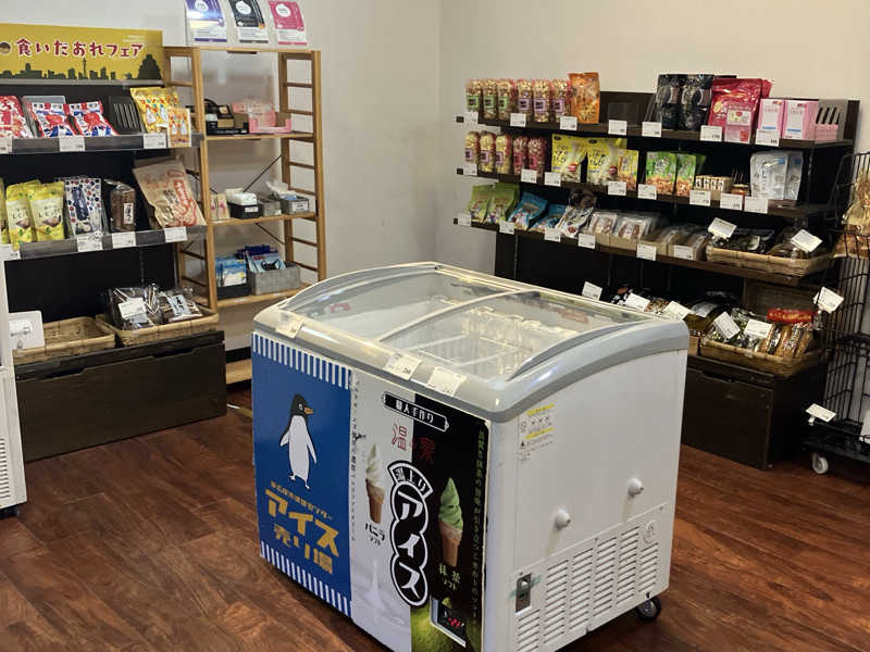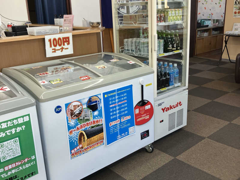 ファッション誌や岩盤浴の説明POPがあるちょっと広い空間でドリンク用の冷蔵庫も置いてあった。