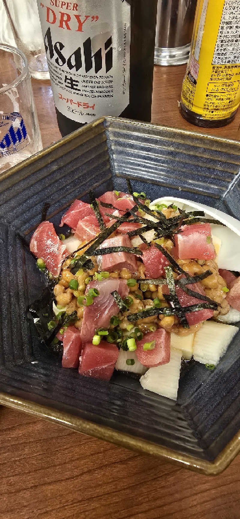 何かわからなかったから頼んでみたら、お刺身の切り落とし山芋納豆ののった絹豆腐だった!