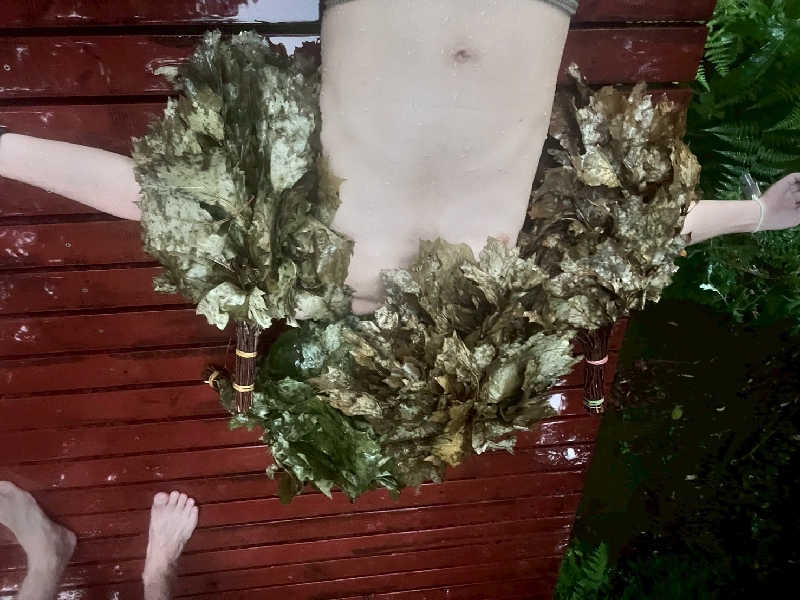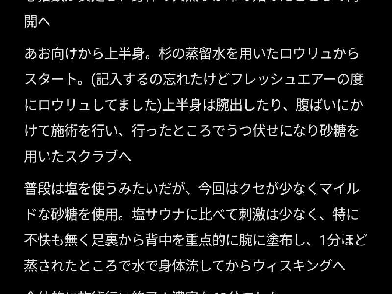 ロウリュして手持ちのウィスクで蒸気を撹拌。熱さよりも気持ち良さ、肌に伝っていく蒸気が心地良い。ウィスクは自分が所持さているヴィヒタと違いオークのもの。一言でオークと言っても色々と種類があるらしいが素人ながらも感じたことはヴィヒタとは違う肌触りに野趣溢れるより緑々した香り。耳や顔を挟まれた時にはあまりの気持ち良さに脛辺りに軽く鳥肌