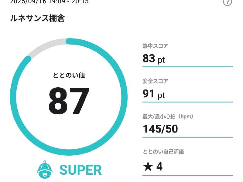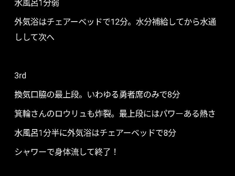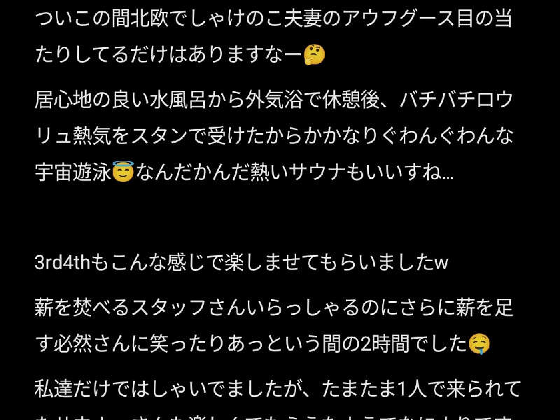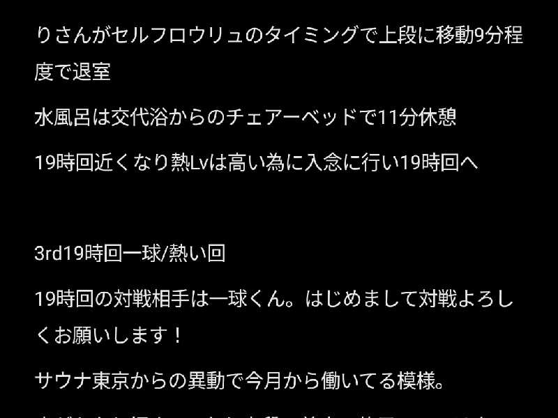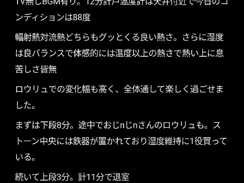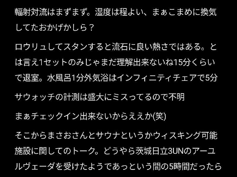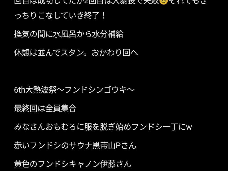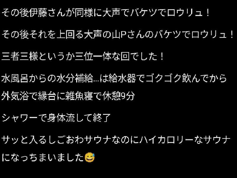 みんなサウナ好きなので、自分が動かなくてももう熱々に仕上がってました(笑)かなり良い具合にロウリュしてて入室した瞬間眼鏡が曇るw特にfumiさんロウリュ上手くてスゴい🙄