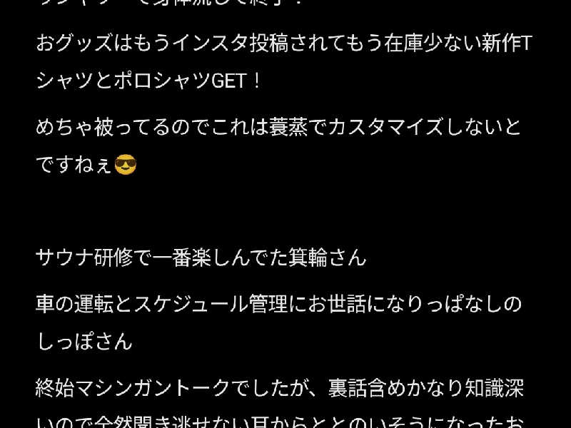 道中車内ではサウナ施設経営者ならではのお話等、耳の穴かっぽじって聞いてとても良い勉強になりました。研修ってだけはあるなぁ