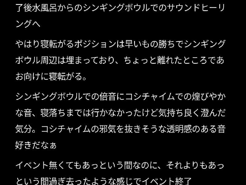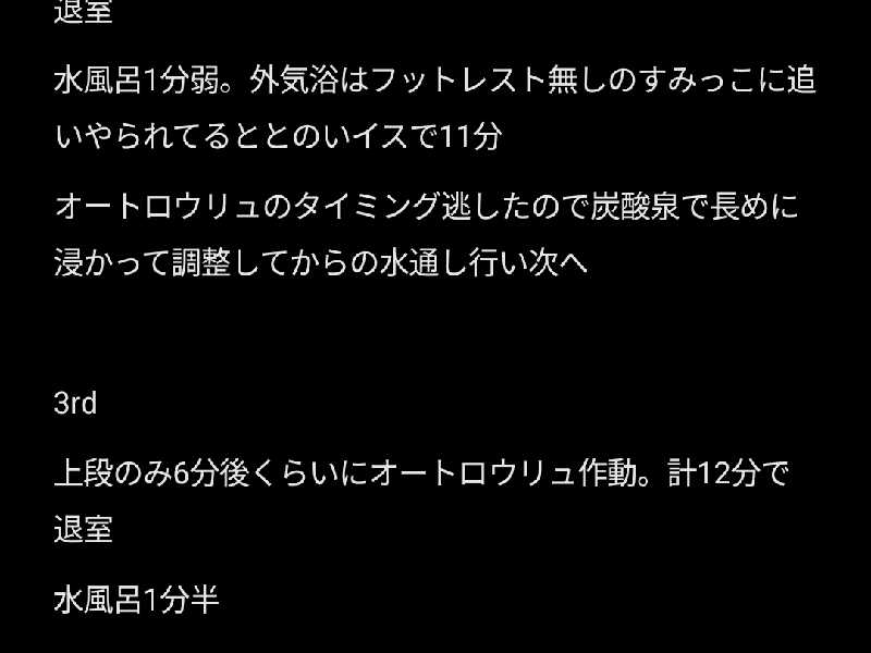 水風呂1分弱外気浴は前述のベストプレイスで11分。軽めの弱トリップ。