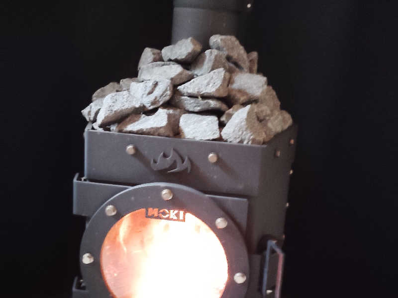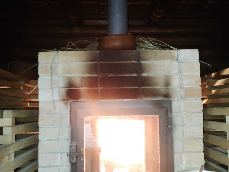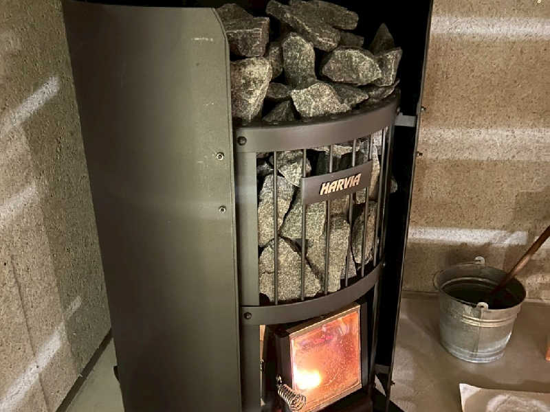 極太ガス管の遠赤ストーブに加え、ロウリュ可能なストーブが追加され熱源がMIXされている