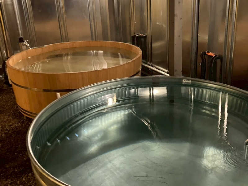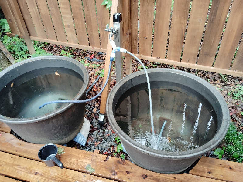 桶のガッシングシャワーで掛け水し、水風呂にin