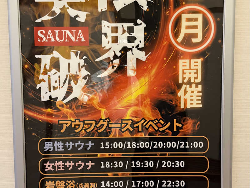 珍しく20:30スタートだったこともあり始まる直前の館内アナウンスで『21:00からアウフグースあります』のご案内でサ室がどよめく笑。訂正アナウンスはまさかの21:30スタートw。多分焦っちゃったんだろうな〜笑