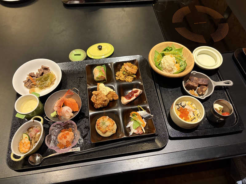 ソフトドリンク、アルコール、白米、炊き込みご飯、味噌汁、お茶漬け、漬け物、ふりかけなどが食べ飲み放題。朝は2種類のカレーも食べ放題になる。