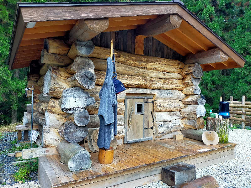 サ室の壁面は丸太でいい感じ。狙ったのではなく簡素に造ったらこうなったのだろう。