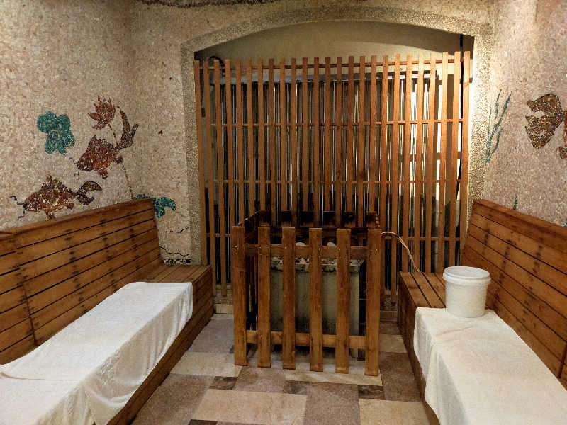 薬草スチームサウナは、座ると今ひとつだけど、椅子の上に立ってみると5分もあれば茹であがる。