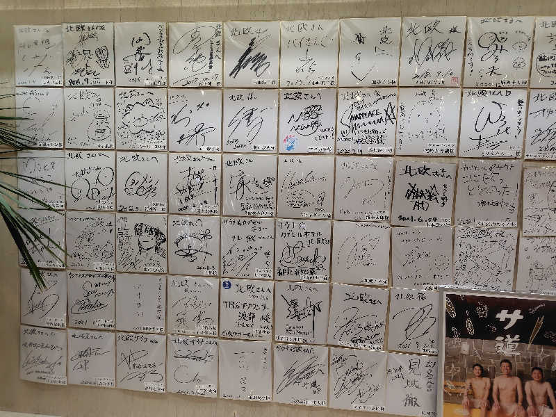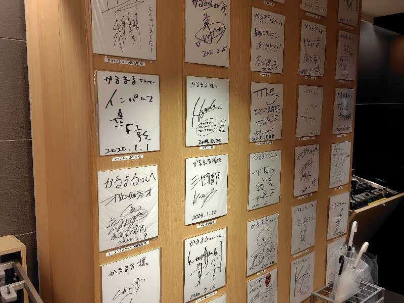 エレベーターを上がりフロントに着くと、壁一面に有名人の来場記念サイン色紙がずらりとお出迎え。受付を済ませ、早速サウナへ向かいました。