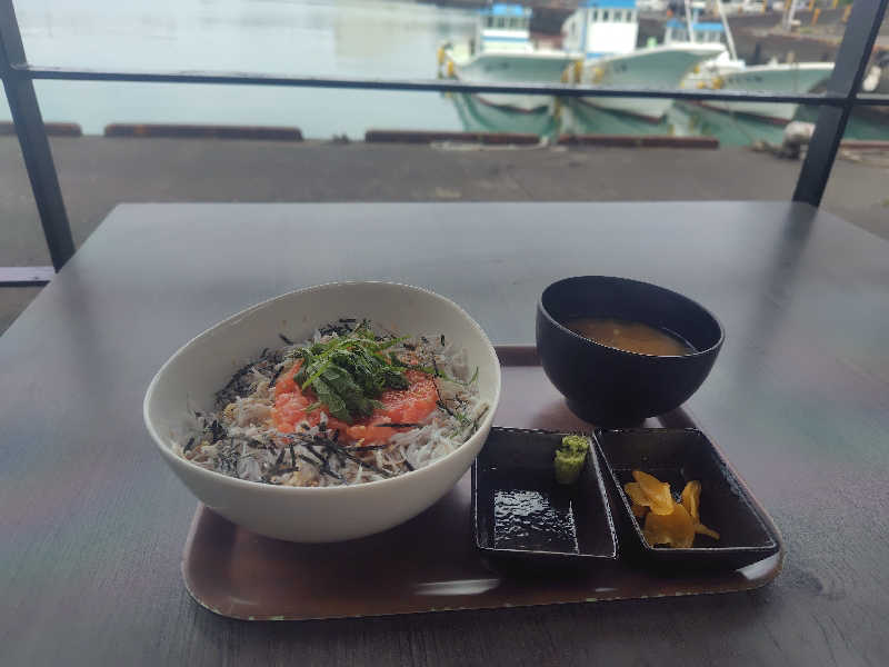 到着後、まずは食堂で腹ごしらえ。新鮮なしらす丼を、船着場に停留している船を眺めながら外のテラス席でいただきました。磯の香りと潮風に包まれながら食べて美味しかったです。