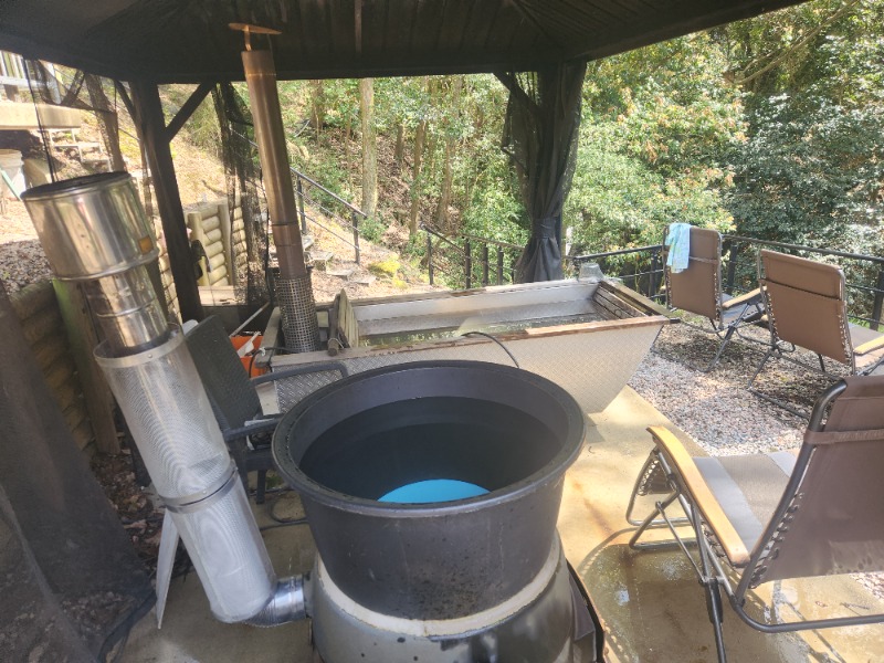 小屋から出てすぐに水風呂があるので、まずはそこでクールダウンして休憩。あろうことかマイ座マットを1セット目に室内に置いてきたままにしてしまい、2セット目に取りに行くと熱で変形してました。なんて熱さ!