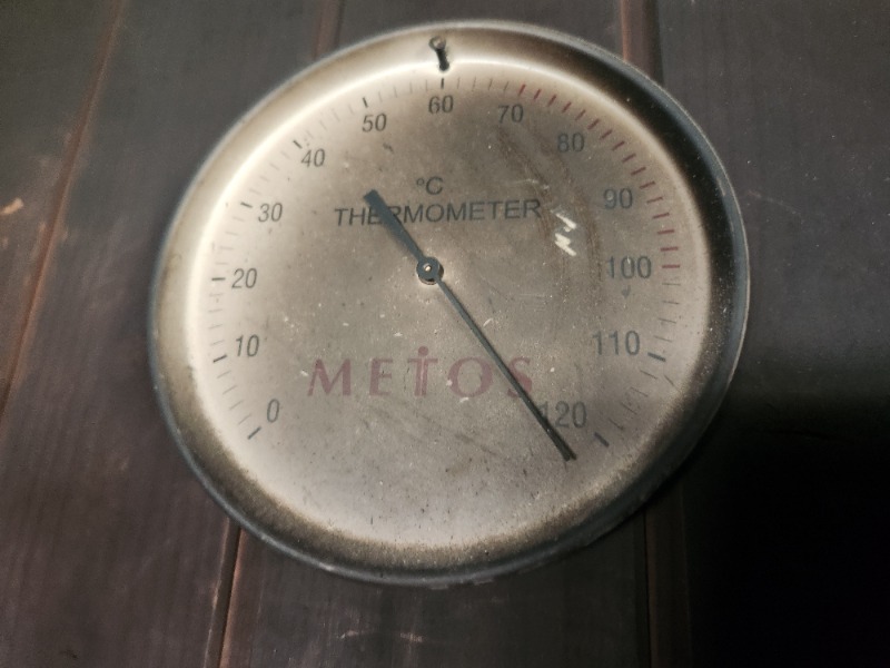 小屋の中に入ってみて、とにかく熱い!猛烈に熱い!温度計を見ると120℃を振りきってます。壊れてるかと思いスタッフさんに尋ねると温度は合ってるそうです。セルフロウリュで一杯かけただけであっという間に顔を覆わずにいられないほどの激烈な熱さに。