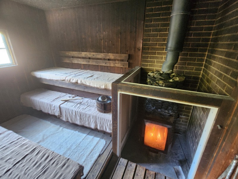 通常の温泉のサウナと別場所の小屋サウナが二つあり、滝のサウナのほうへ。パブリックなので大阪から来たというお姉様がた三人組とご一緒させてもらいました。