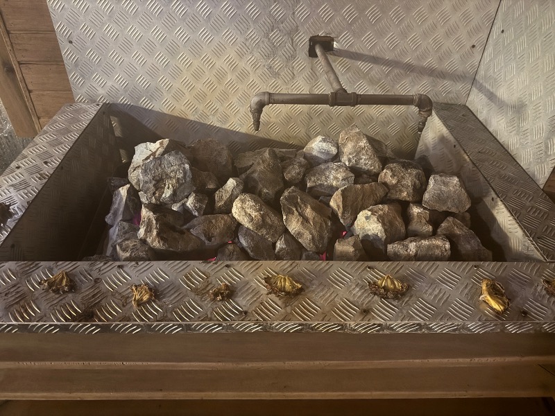 サウナストーブの前の柵にはマッコリを飲む時に使うサバルくらいの入れ物が置かれており、おそらくそこから蒸発していると思われる水とアロマが心地良い空間を作り出している。