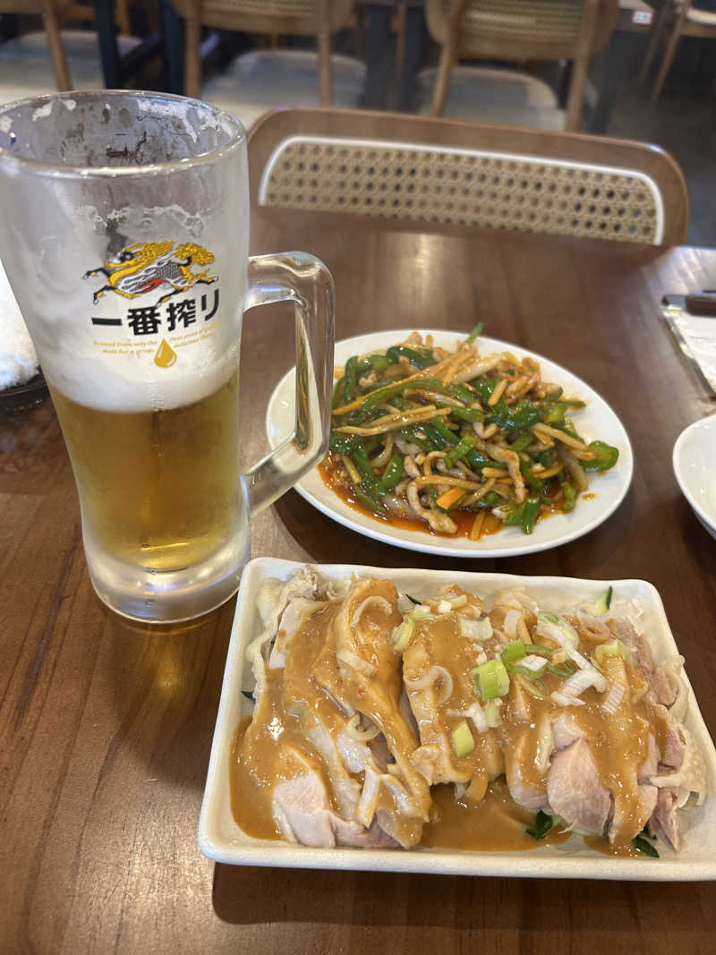 生ビール、棒棒鶏、青椒肉絲(辛口)