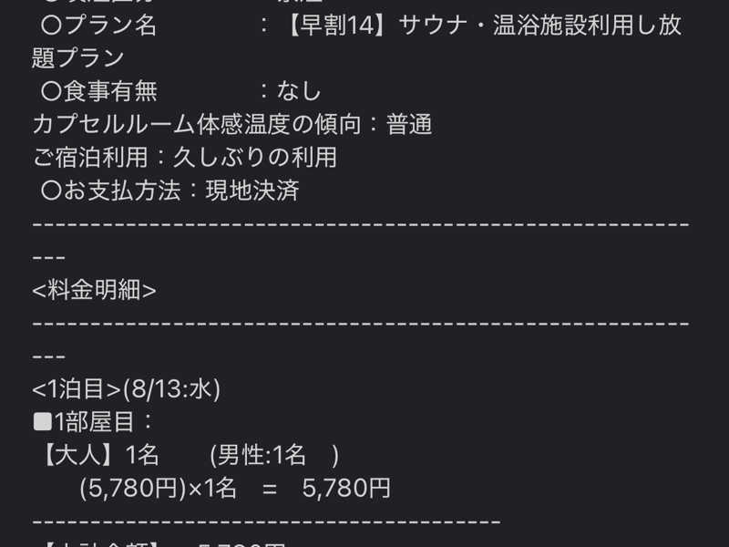 お盆の週、水曜日、カプセル宿泊19時間滞在、3食館内