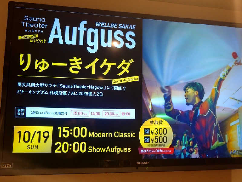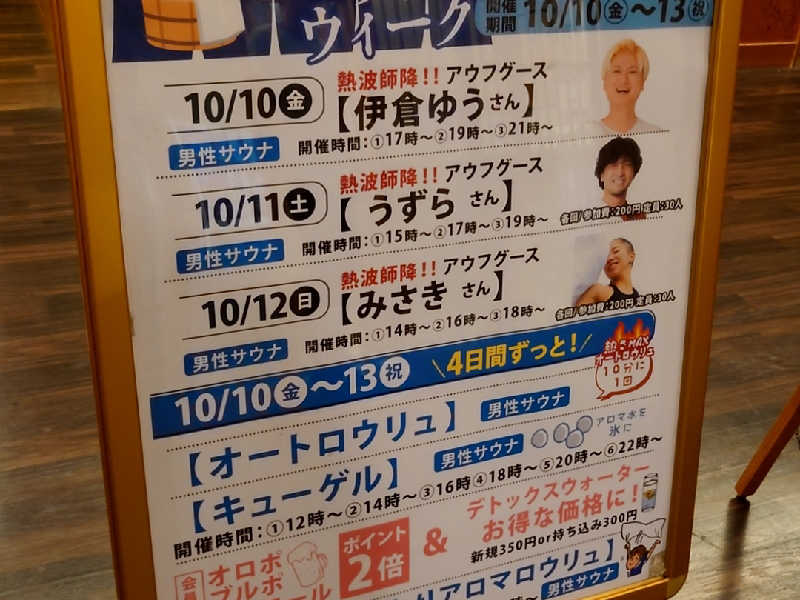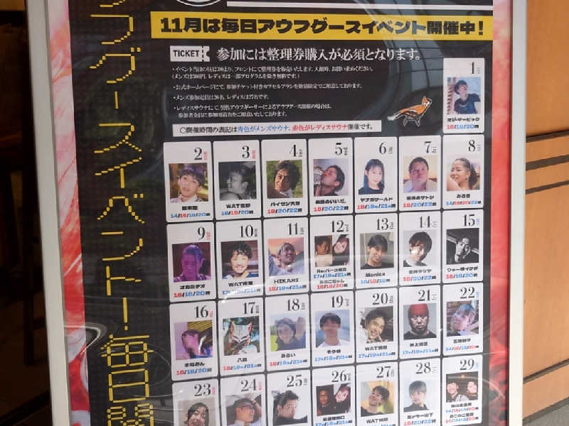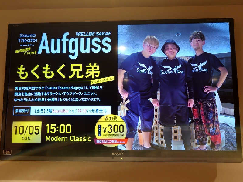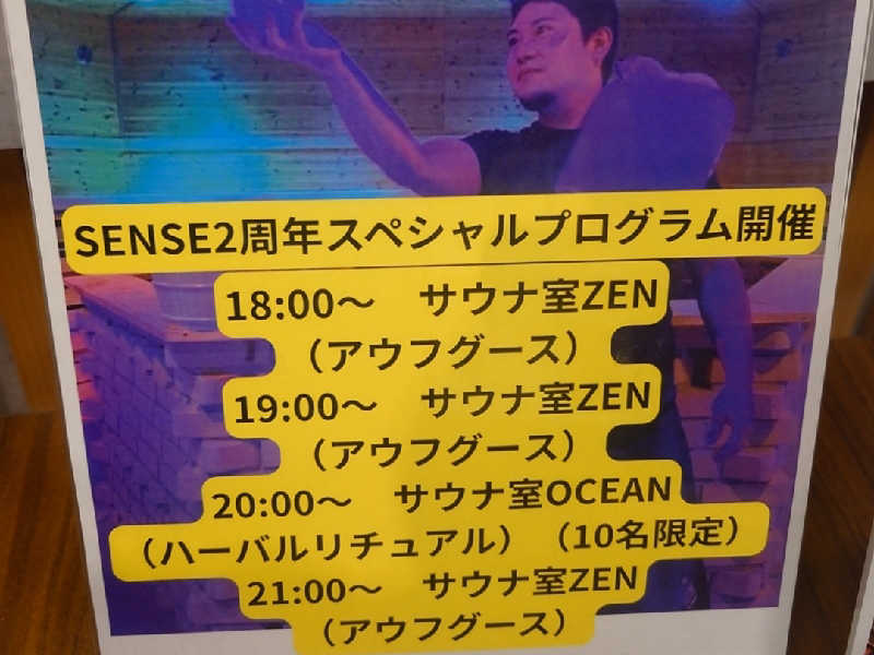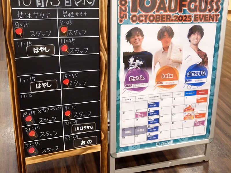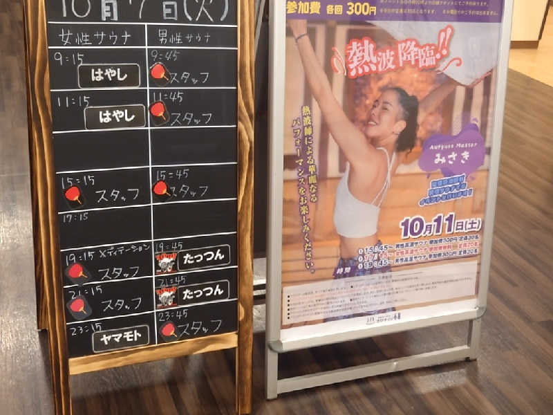漢のサウナを覗くとスタッフさんがアウフグースをしている!間に合わないかぁと思ってゆっくり洗体してお風呂に入って出る。再びサ室を覗くとまだアウフグースをしていたので入室!気づいたのがあれ?前と雰囲気が違う?前は中年の方の熱波に近い扇ぎでしたが、今は若い方がアウフグースの技を取り入れてタオルをクルクル回していました!これは見応えがある🤩この回は3分くらい受けて終了😊