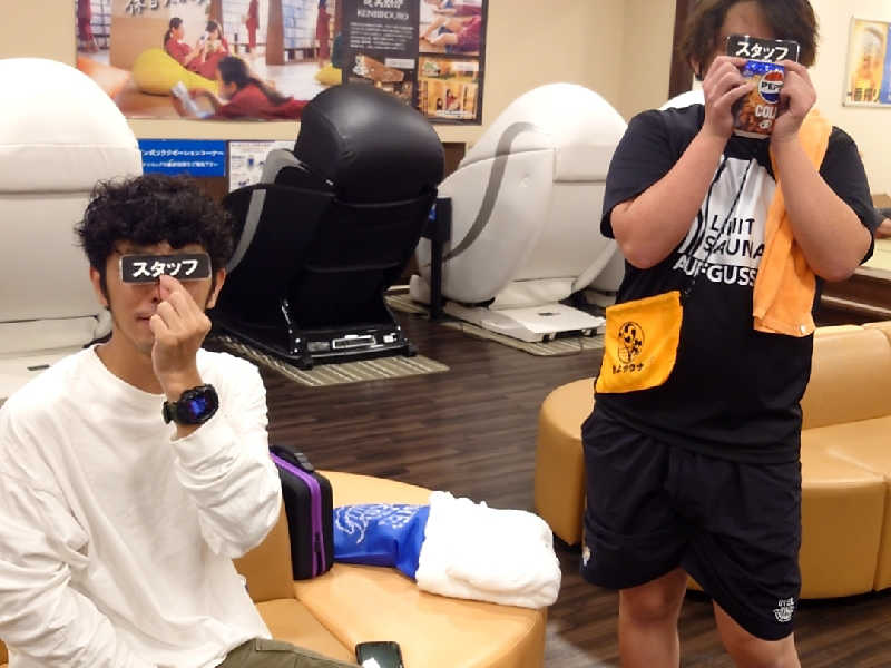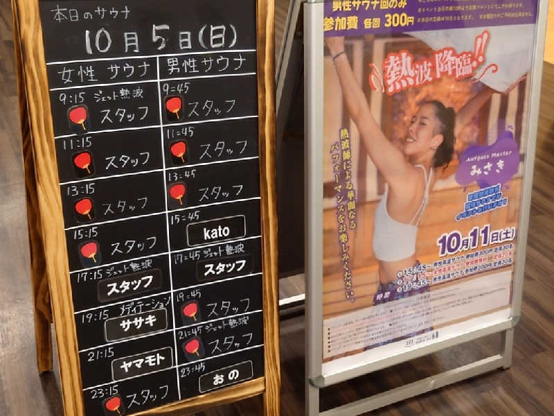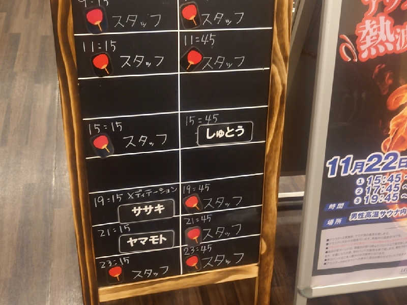自己紹介からの1セット目スタート!ロウリュの所作が丁寧。キューゲルもいい位置に投下成功!静まったサ室で見つめるみんなの目がまるで我が子を見るかのよう…笑撹拌からのパラシュート!緊張する中でも堂々としていました!風も来ていて気持ち良さも感じられました✨2セット目、たっつんさんにバトンタッチ!めちゃめちゃノリノリでキレ味抜群の扇ぎでお客さんを魅了!!そしてヤマモトさん&ササキさんにバトンタッチ!お二人の新鮮さにお客さんたちも拍手喝采!!続くセットは館内着シュトウくんの若さ溢れるパワフルな扇ぎ!また一皮むけたか🤣そしてところくんと2人での扇ぎ!!からのたっつんさん再登場で焼却フィニッシュ🔥とりあえず覚えているだけ書きました笑多分合ってるw