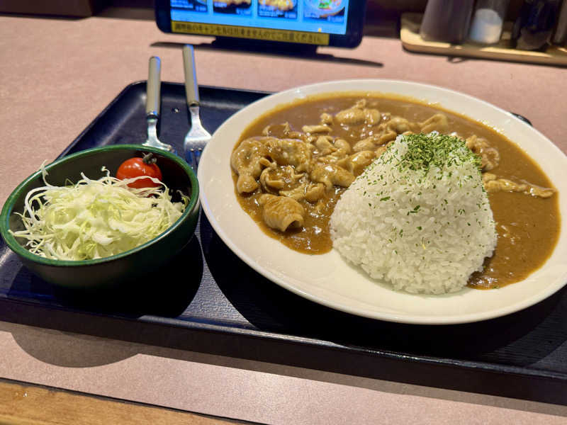 夕食はお食事処・彩味庵にて、オアシス名物の富士山もつカレー🍛✨ぷりっぷりのモツが、これでもかっ‼️てくらいにてんこ盛り🤣ご飯普通盛りでもお腹いっぱいです😋