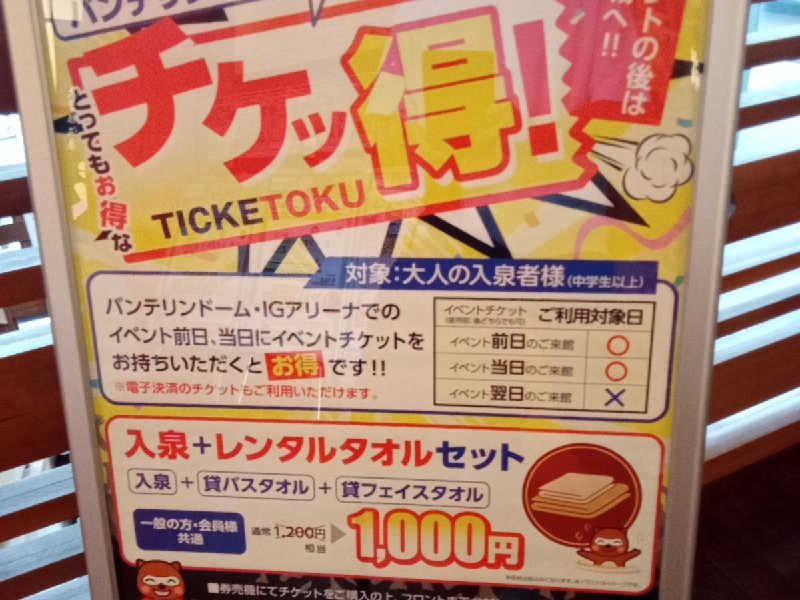 1200円でタオルは別フェイスタオルは250円で販売のみ。コスパ満足度はちょっと低いかな~。名古屋のスーパー銭湯に気持ちがいっちゃうかな~
