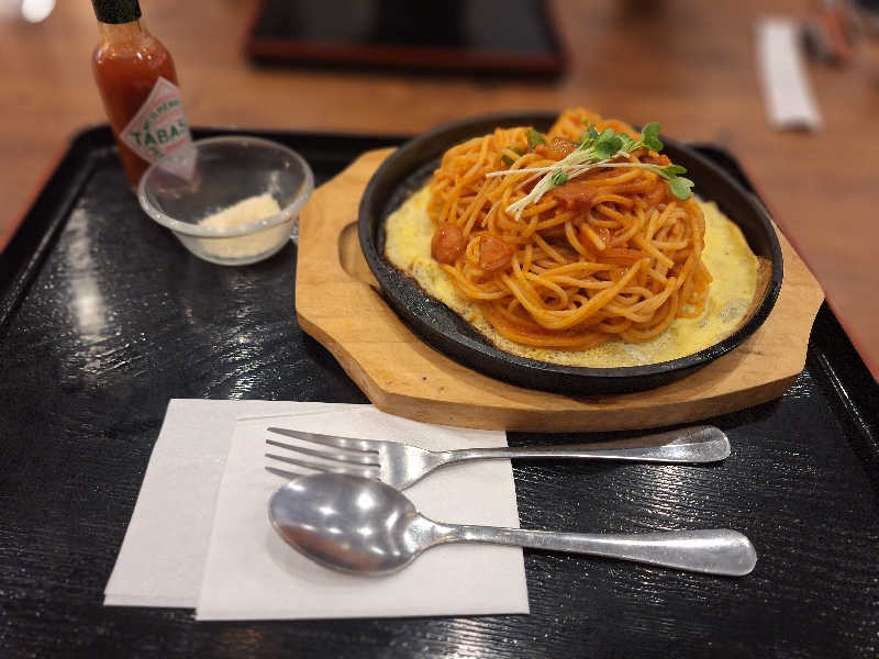 ナポリタンの下に玉子が敷いてあって熱々でとても美味しかったです❗