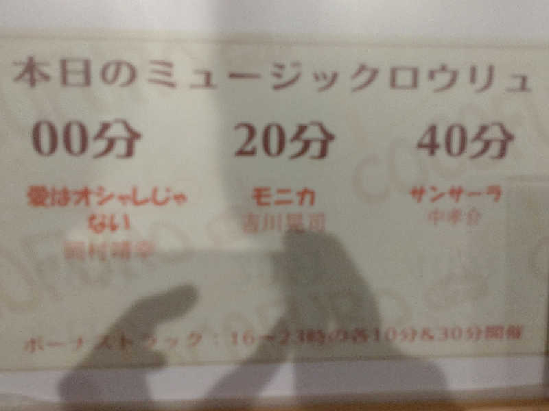 サウナ:手酌蒸気(1段目7分)、蒸喜乱舞(1段目5分)、戸棚蒸風呂(3分)、昭和遠赤(1段目5分)、手酌蒸気(1段目3分)、蒸喜乱舞(2段目11分アウフグース)、瞑想(5分)