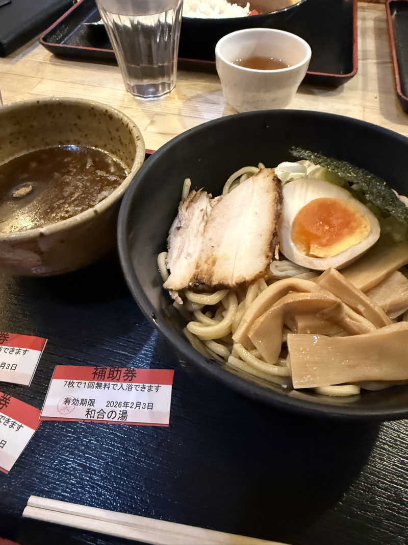 今日は早めの晩ごはんにしようと決めていた。注文したのは特製つけ麺。運ばれてきた瞬間、食欲を刺激する香りがふわりと立ち上った。魚粉たっぷりの濃厚なつけだれに麺を潜らせると、しっかり絡んで離れない。その一本一本に旨味がまとわりつく感じがたまらない。和合の湯に来てまで麺に感動するとは思わなかったが、美味しい食事もまた魅力のひとつだ。