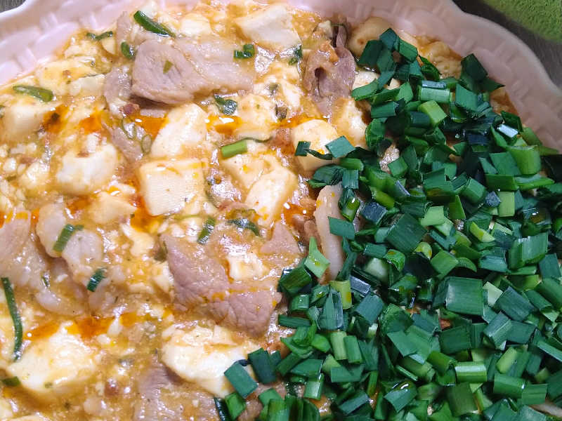 挽肉の代わりに豚肉切り落としで作った麻婆豆腐ニラ添えはマーニラって言うのかw