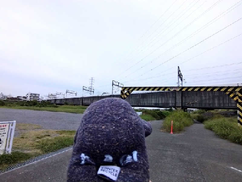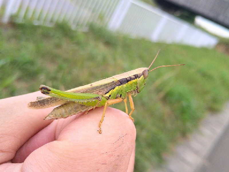 鶴見川沿いを散歩し、クツシタ人と新幹線待ちをしていた時に、今日はコバネイナゴと遭遇したので2S記念撮影🦗写真②
