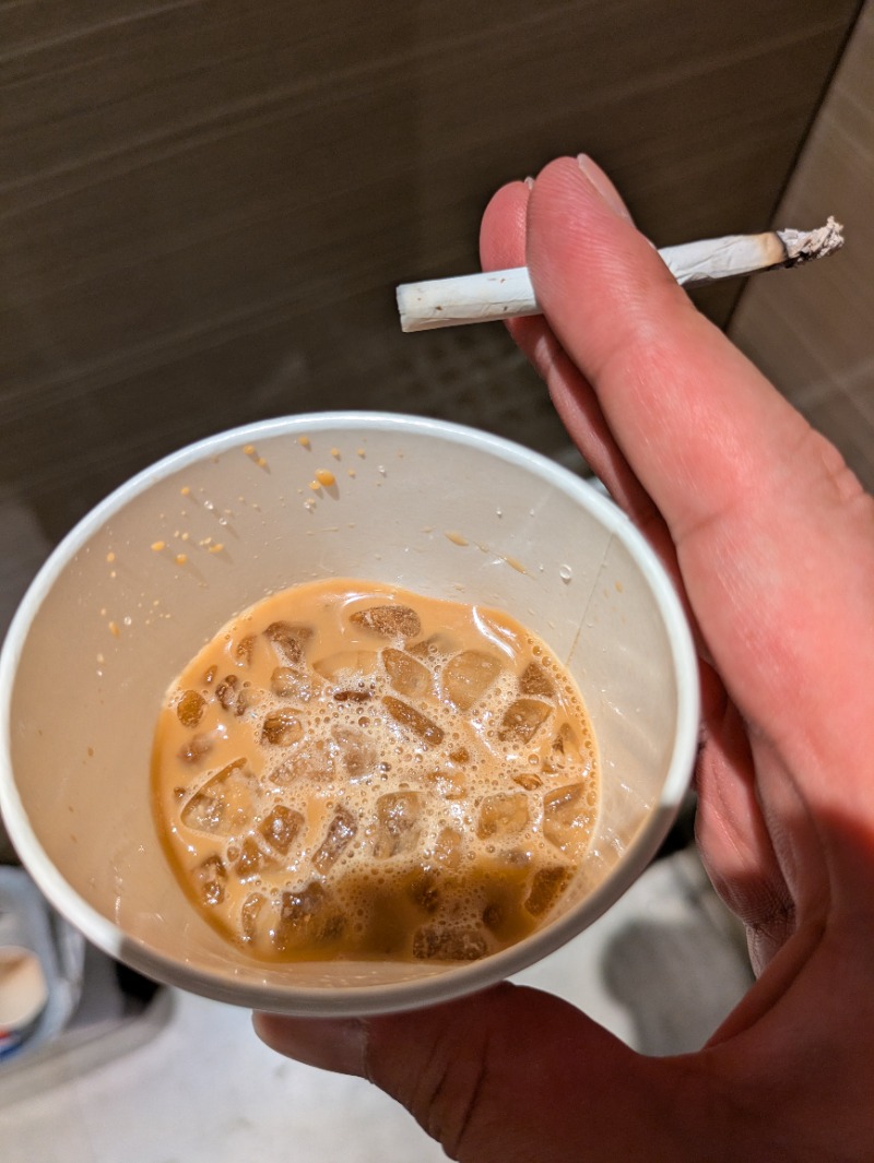 2階ラウンジはチキンライスと豚骨ラ茶漬けでしたが、晩御飯あるため濃いめストロングアイスコーヒー飲みながらぷかぷか二服。