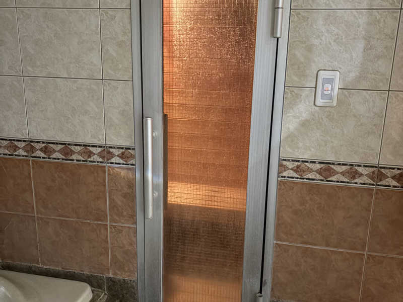 サ室の扉は暫く壊れたままで開きっ放し(・・;) そのかわりカーテンが取り付けられています。扉のように大きく開かないから、この方が熱気は逃げないのかな。きちんと90℃を維持していました。