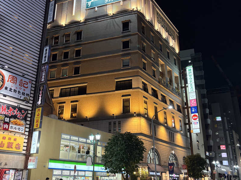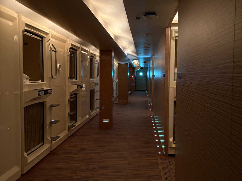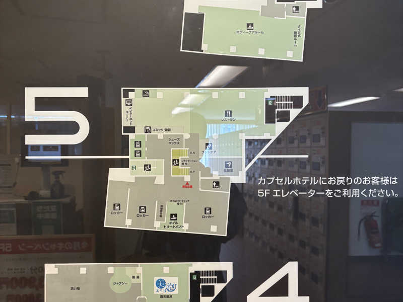 6階が受付けと更衣ロッカー。7階が浴室エリア。8階が食事処と休憩スペース。4階は個室サウナで5階がカプセルホテルです。