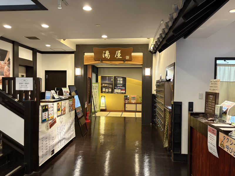 1Fは受付けと食事処。2Fが浴室、岩盤浴、休憩所。和風の趣きで広々として明るく綺麗です。非常に印象がいい。エレベーターの中にも畳が敷いてあります。更衣室には270ヶ所のロッカーがあり広々として明るい。