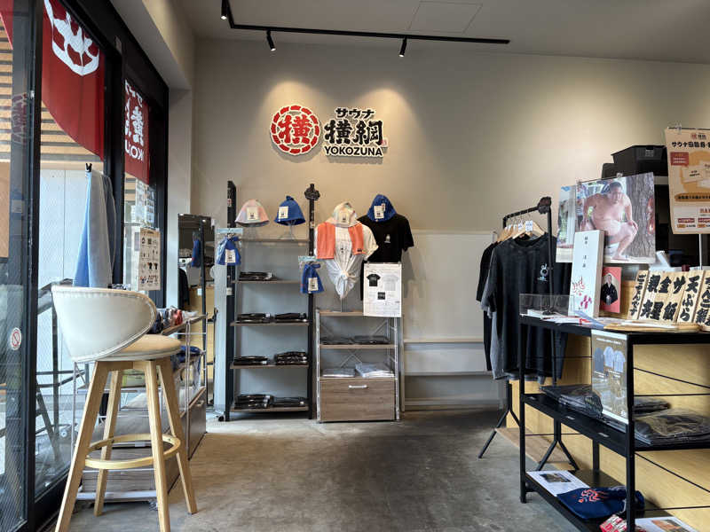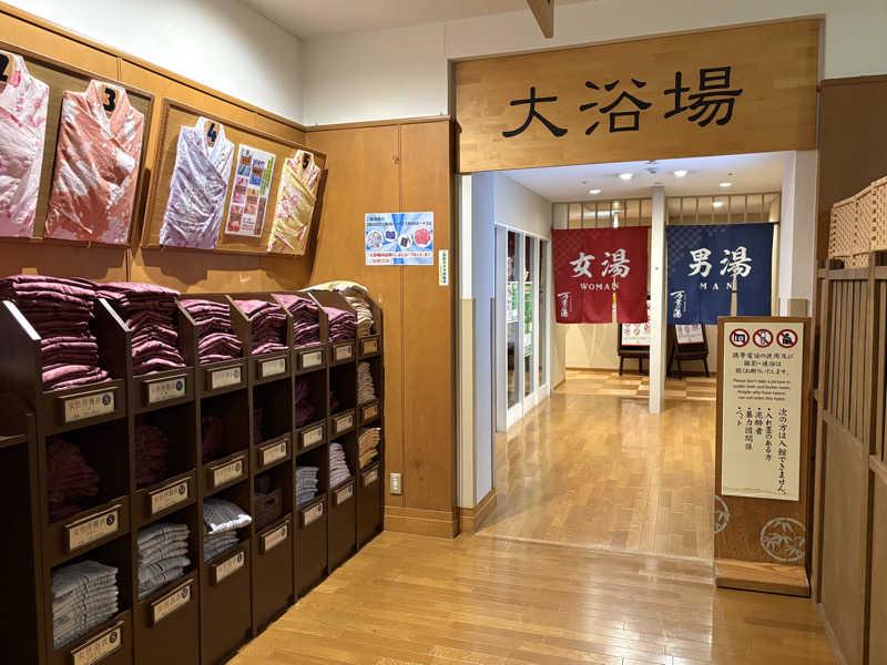 通路の正面が浴室・サウナエリア。入り口脇にバスタオル、浴衣などが置いてあります。