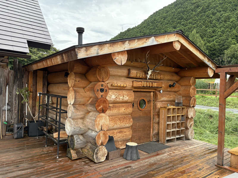 丸太で組んだサウナ小屋。入口脇に水に漬けたヴィヒタが置いてあります。サウナ室に入ると目の前に煉瓦を積んだ空間。その中に円柱形のサウナストーブ83℃ 2段式13人用。