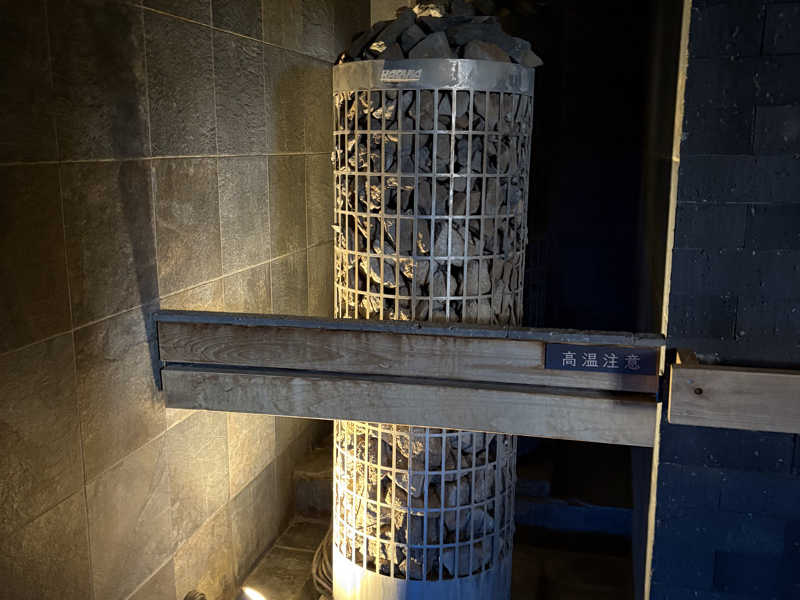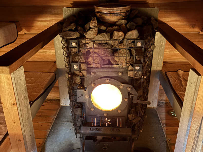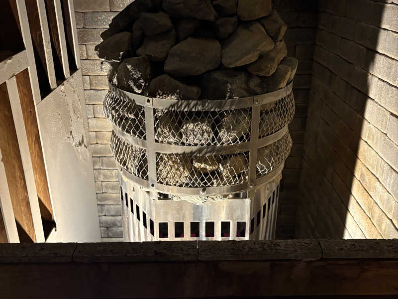 3段式40人用。入って左側のレンガに囲まれた空間に長方形の巨大なサウナストーブ102℃ 壁は渋い色。これはフィンランドから取り寄せたパイン材を使用しているため。