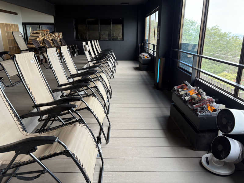 露天エリアに木製の大きなベンチが2つ。リラックスチェア7つ。浴室内にもリラックスチェアが5つあります。