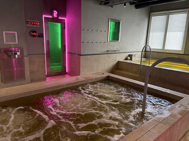 浴室に入ると正面に円形の天然温泉40℃ 天井が高い。右側には21ヶ所の洗い場。左後ろは塩サウナと岩盤浴。38℃の寝湯にバイブラ、ジェット風呂。初心者用の水風呂も有ります。メインサウナは円形浴槽の左側。