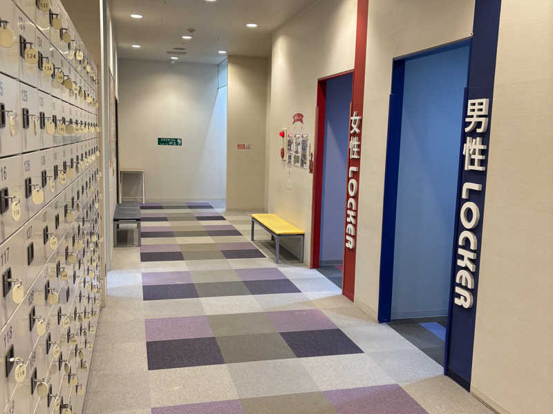 受付けで靴箱キーを渡すとicタグの付いたロッカーキーを渡されます。初めてですと伝えるとお姉さんが親切に案内してくれます。男性は受付け脇の階段で3階に上がる。そこに225ヶ所の更衣ロッカー。ちょい狭め。