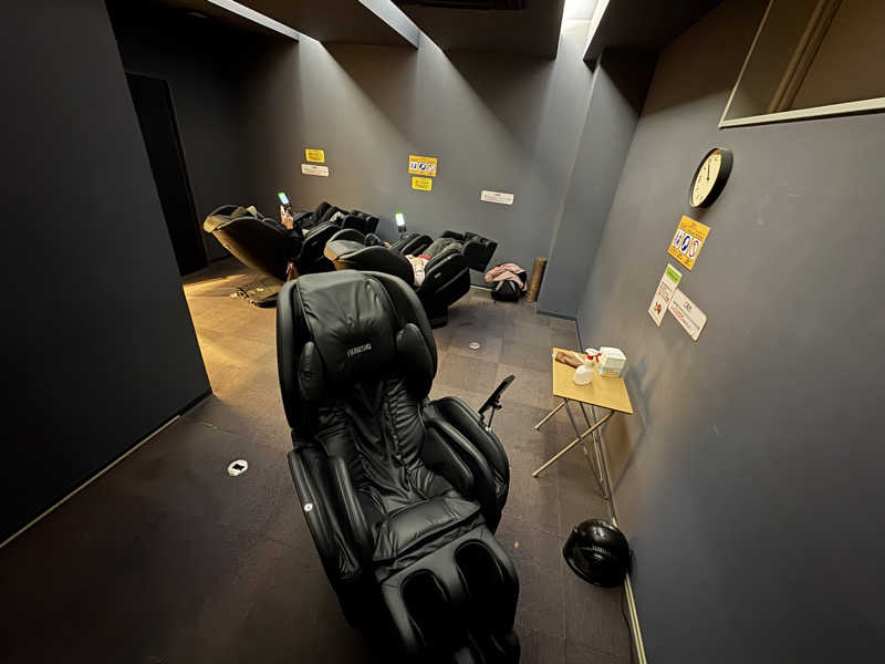 左側には暗いお部屋。リクライニングソファーの休憩室で凄く落ち着ける。おじさん達が気持ち良さそうにお昼寝しています。脇に登る階段があり4階が食堂。