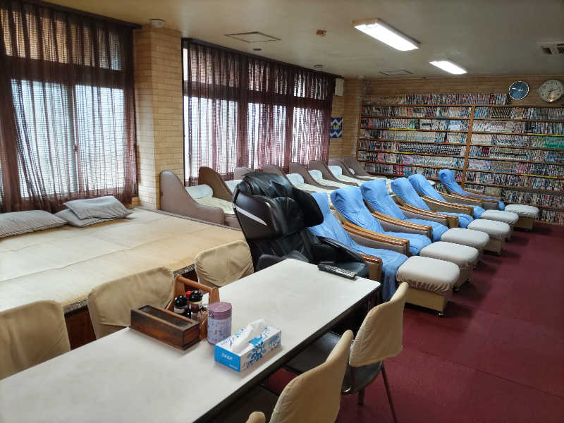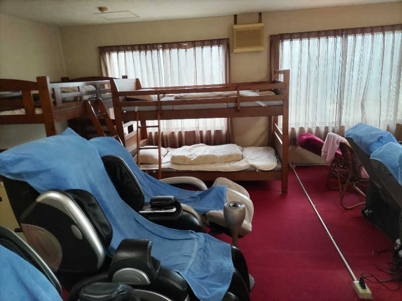 サウナを出ると目の前に喫煙可休憩室があります。2段ベッド、マッサージ機等々が完備。2階で着替えてマッサージ機ゴロゴロ。(もちろん無料)。