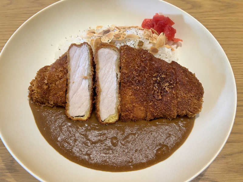 極厚切りのトンカツとスパイスがガッツリ効いたカレーの融合。 サウナとあいまってもはや最強。