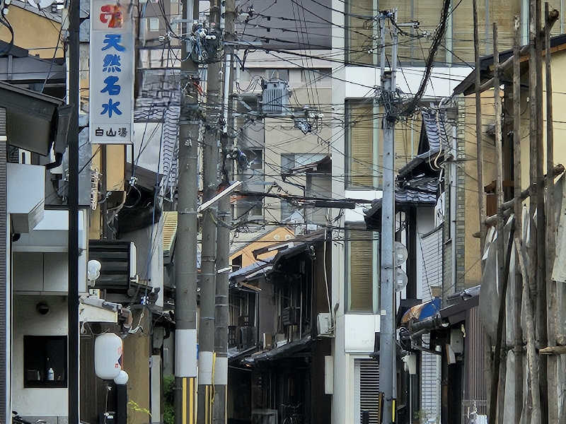祇園商店街に溶け込む佇まい。3階がカプセル受付、6階がサウナ&スパです。