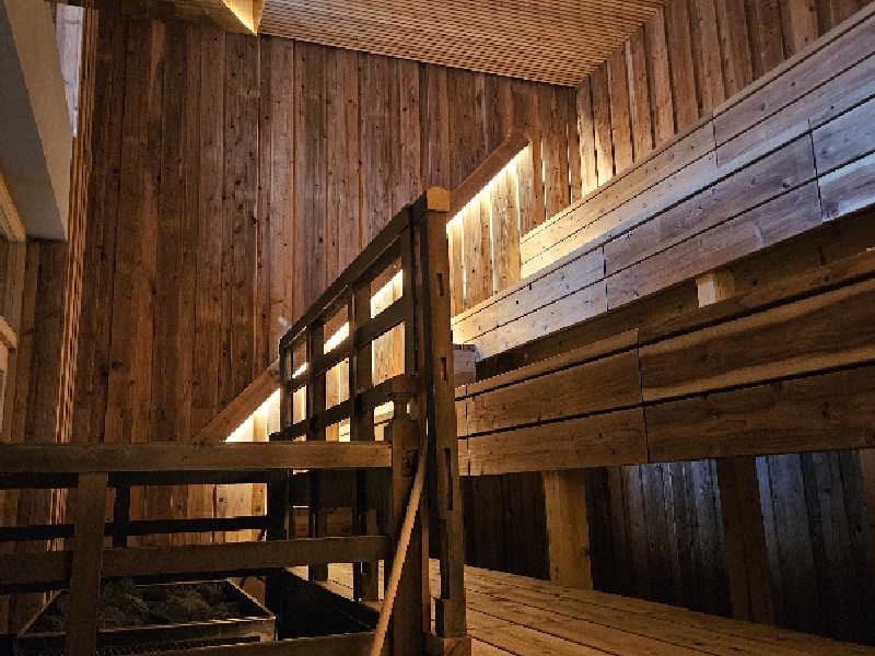 浴室から階段を上がりフィンランドサウナへ。風徐室を経て中に入ると薄暗くヒーリング音楽が響く落ち着いた空間。