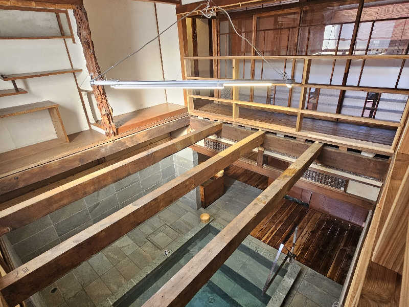 2階部分もトトノイスペースになるそうですがプレオープンではまだイスなどは準備中とのこと。回廊状になっており朱色の簾や経年変化した木が調和して、風情を感じる空間が広がっていました。