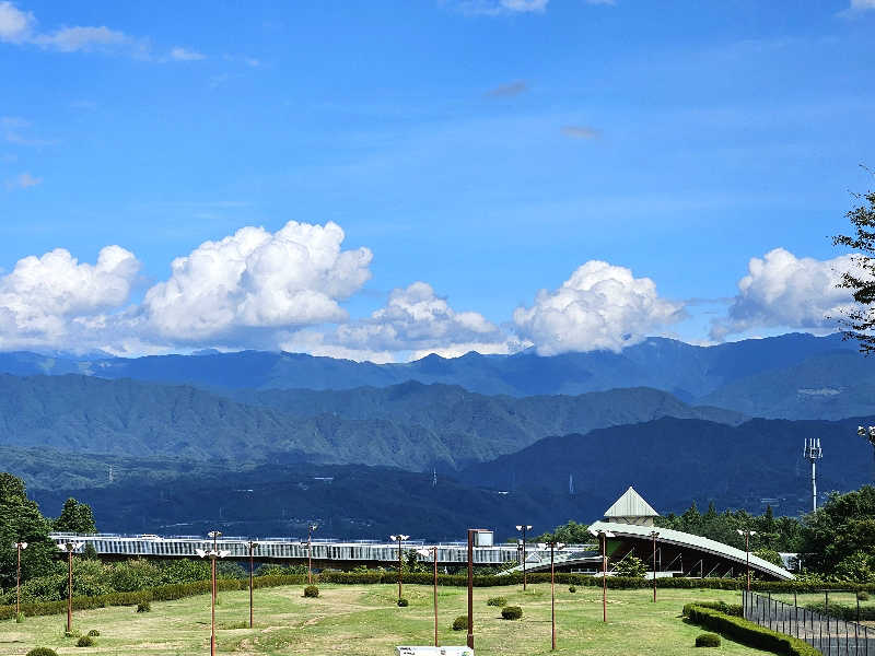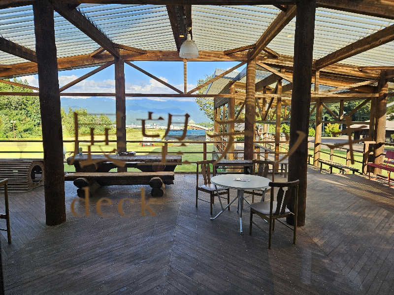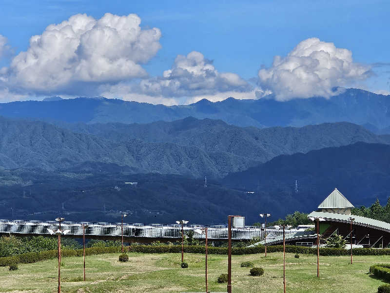 浴室を出て座敷の休憩スペースには展望デッキがあります。高台からのロケーションを活かした南アルプスの雄大な景色を眺められるのがとても好きです。