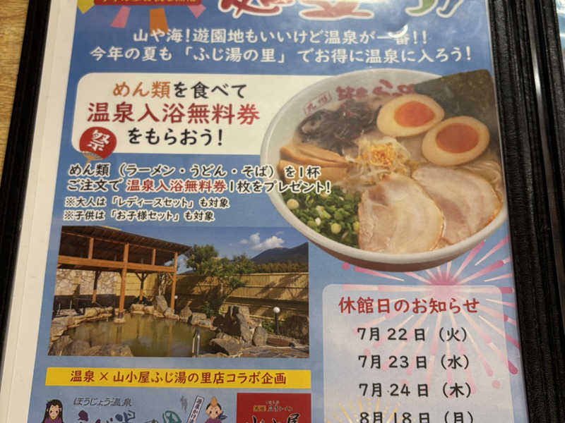 昨日から調べていたのですが施設内にある筑豊ラーメン山小屋とのコラボイベントで麺類を食べると温泉入浴無料券がもらえるという大盤振る舞いなことをやっていたので迷うことなく来てしまいました。