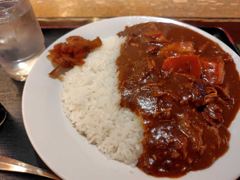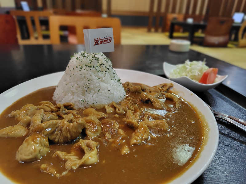 ととのった後、お食事処で、はんぺんフライ&富士山もつカレーを注文 もつがたっぷりで美味しい