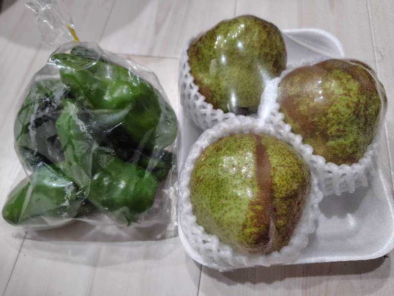 入浴後、受付前で販売をしていたピーマン(110円!)とラ・フランスを購入しました。